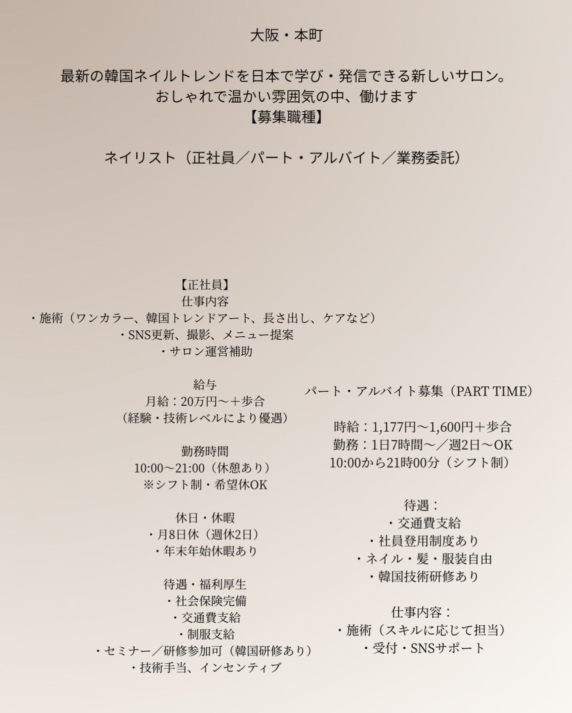 私たちと一緒にネイルサロンを盛り上げてくださる仲間を募集しています✨「新しいことにチャレンジしたい」「お客様に喜んでもらいたい」そんな熱意のある方、未経験の方も大歓迎です‼️