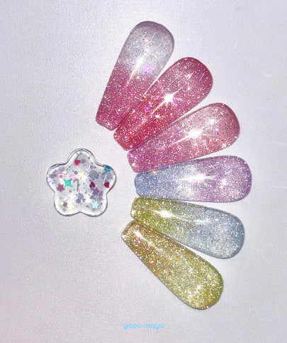 リフレクターグリッターを配合した、夢のようなシロップジェル7種類と、完璧な仕上がりを叶えるキュートなトッピンググリッタージェル1種類。